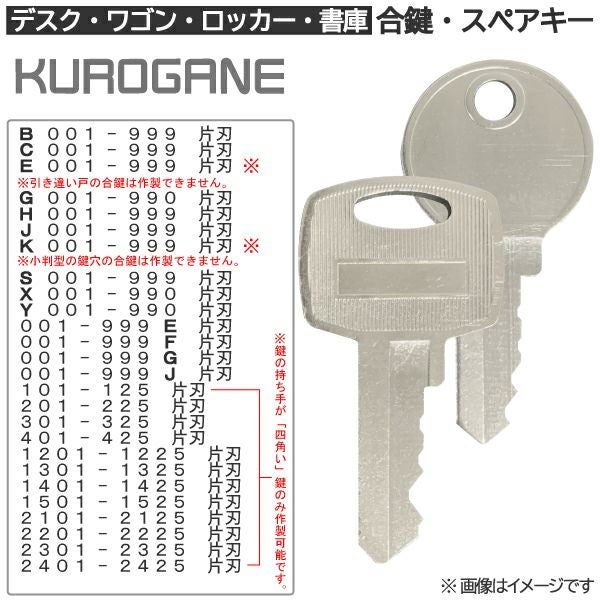 「KUROGANE(クロガネ)」製のロッカー・デスク・ワゴン・キャビネット・袖机・脇机・書庫・保管庫 用の合鍵(スペアキー)を当店にて作製・お届けします。 メーカー純正品の合鍵と比べ、圧倒的に「安く・早く・カンタン♪」に作製できます。 しかもメーカーと同じく「カギ番号」から作製するので、店頭で削られるコピーキーよりも「精度の高いメーカー品質と同じような合鍵」を作製します。 【作製可能カギ番号(形状)リスト】 B 001~999 (片刃) C 001~999 (片刃) E 001~999 (片刃) G 001~990 (片刃) H 001~999 (片刃) J 001~999 (片刃) K 001~999 (片刃) S 001~999 (片刃) X 001~990 (片刃) Y 001~990 (片刃) 001~999 E (片刃) 001~999 F (片刃) 001~999 G (片刃) 001~999 J (片刃) 101~125 (片刃) 201~225 (片刃) 301~325 (片刃) 401~425 (片刃) 1201~1225 (片刃) 1301~1325 (片刃) 1401~1425 (片刃) 1501~1525 (片刃) 2101~2125 (片刃) 2201~2225 (片刃) 2301~2325 (片刃) 2401~2425 (片刃) 【注意事項】 ※上記リストに無いカギ番号、形状のものは作製できません。 ※カギ番号は鍵穴を挟んで刻印されている場合もあります。 アルファベットの見落としや入力漏れのないようにご注意ください。 ※上記リストに記載されている鍵の形状(片刃・両刃)は「当店で作製可能な形状」になります。 リストに記載のない形状でもメーカー設定として存在する可能性がありますのでご確認ください。 ※カギ番号及びメーカーロゴは刻印されません。 お届けする合鍵に刻印されている番号はカギ番号ではなく、キーブランク型番ですのでご了承ください。