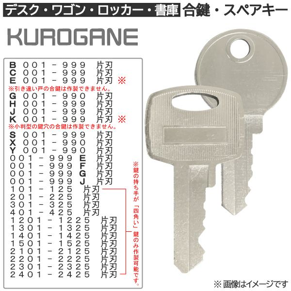 「KUROGANE(クロガネ)」製のロッカー・デスク・ワゴン・キャビネット・袖机・脇机・書庫・保管庫 用の合鍵(スペアキー)を当店にて作製・お届けします。 メーカー純正品の合鍵と比べ、圧倒的に「安く・早く・カンタン♪」に作製できます。 しかもメーカーと同じく「カギ番号」から作製するので、店頭で削られるコピーキーよりも「精度の高いメーカー品質と同じような合鍵」を作製します。 【作製可能カギ番号(形状)リスト】 B 001~999 (片刃) C 001~999 (片刃) E 001~999 (片刃) G 001~990 (片刃) H 001~999 (片刃) J 001~999 (片刃) K 001~999 (片刃) S 001~999 (片刃) X 001~990 (片刃) Y 001~990 (片刃) 001~999 E (片刃) 001~999 F (片刃) 001~999 G (片刃) 001~999 J (片刃) 101~125 (片刃) 201~225 (片刃) 301~325 (片刃) 401~425 (片刃) 1201~1225 (片刃) 1301~1325 (片刃) 1401~1425 (片刃) 1501~1525 (片刃) 2101~2125 (片刃) 2201~2225 (片刃) 2301~2325 (片刃) 2401~2425 (片刃) 【注意事項】 ※上記リストに無いカギ番号、形状のものは作製できません。 ※カギ番号は鍵穴を挟んで刻印されている場合もあります。 アルファベットの見落としや入力漏れのないようにご注意ください。 ※上記リストに記載されている鍵の形状(片刃・両刃)は「当店で作製可能な形状」になります。 リストに記載のない形状でもメーカー設定として存在する可能性がありますのでご確認ください。 ※カギ番号及びメーカーロゴは刻印されません。 お届けする合鍵に刻印されている番号はカギ番号ではなく、キーブランク型番ですのでご了承ください。